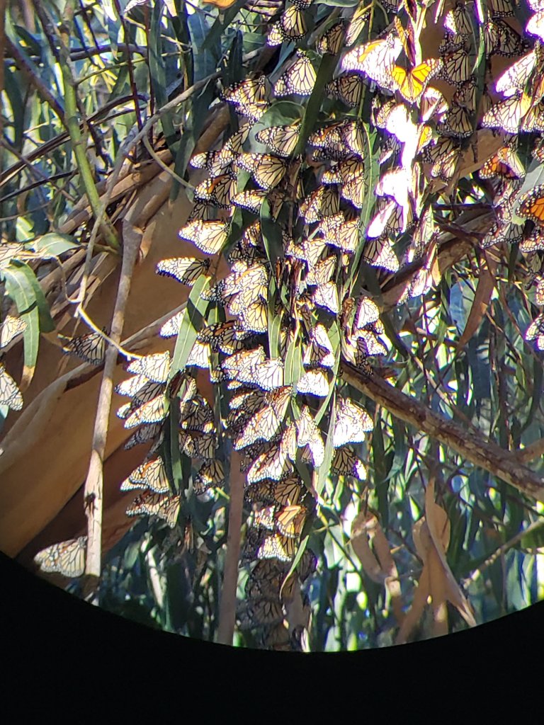 It’s a little hard to tell from the picture above but they hang high up in the trees in huge clusters. Those little specs in the sky – butterflies, too. They were everywhere. The picture below shows the view through a binocular that was set up by the volunteers.