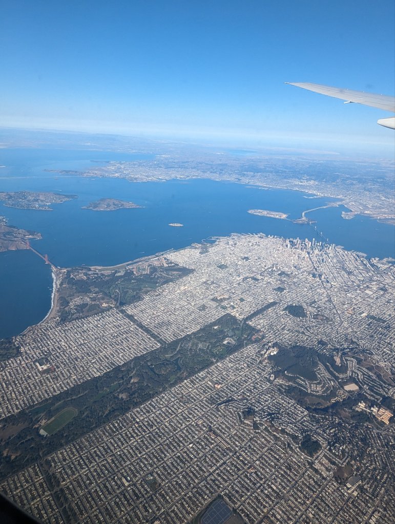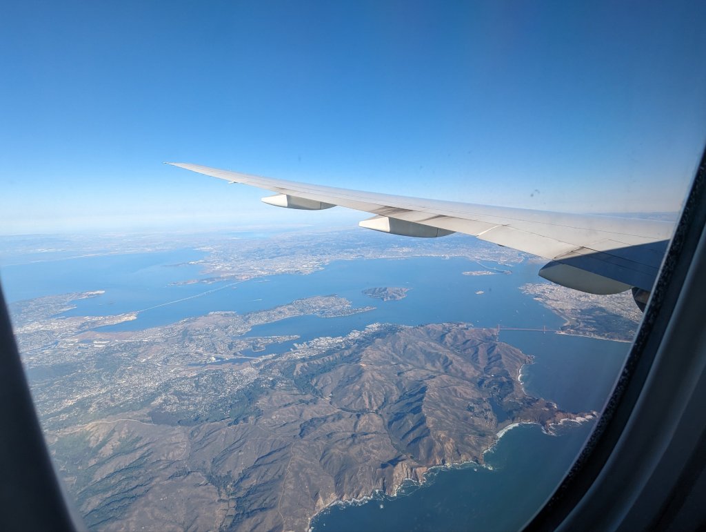 Back to travel day: Bags were packed the day before so everything was ready to go besides the last chargers and some food in case the airline falls short. I left the house at 10am to be driven to the Bart station. Luckily the next train went straight to SFO so I did not have to change. I got there at 11:30am and only had to drop of my checked bags. Isn’t it amazing you can do most everything online now? It’s a nightmare for my 80 year old dad but I do appreciate not having to stay in line for an hour (or longer) to check in. By noon I was through security and went on a search for some lunch. At SFO we somehow always end up at the domestic terminal for that even flying internationally. Boarding started on time at 1:50pm. The flight was supposed to leave at 2:40pm but to no big surprise it took a little longer as we were still waiting for some passengers.
